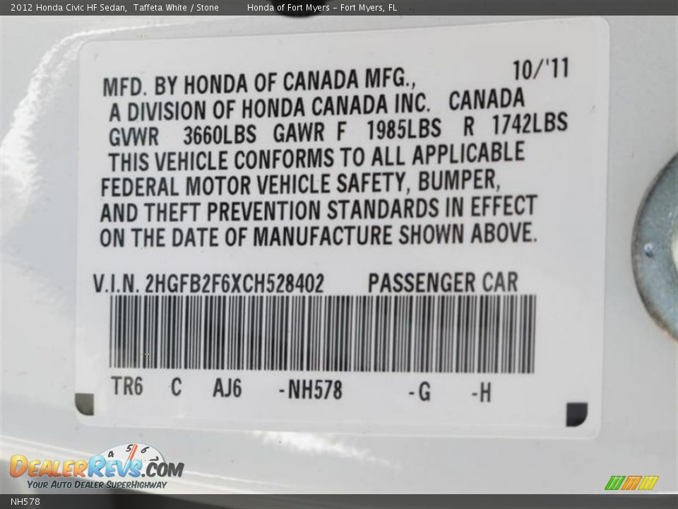 2012 Civic Color Code Nh578x For Taffeta White Photo